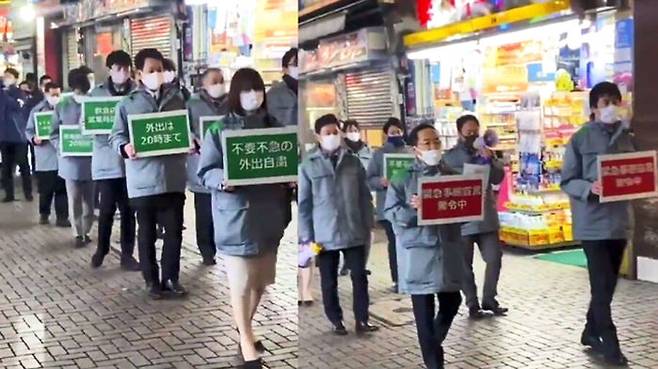 들고 있는 푯말을 보면 "음식점 운영은 20시까지", "외출도 20시까지" "비상사태 선언 발령 중" 이런 내용이 담겨 있는데요.