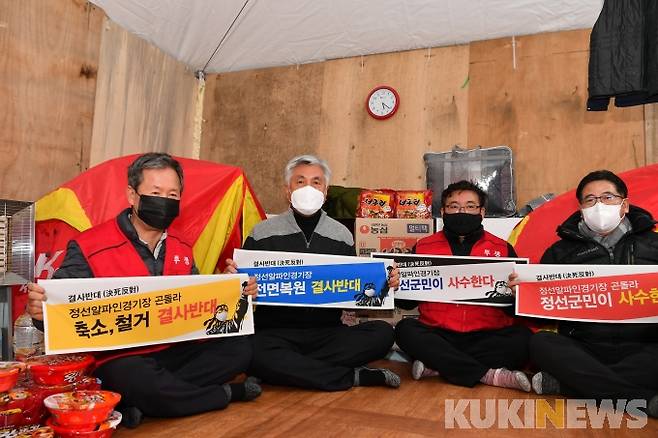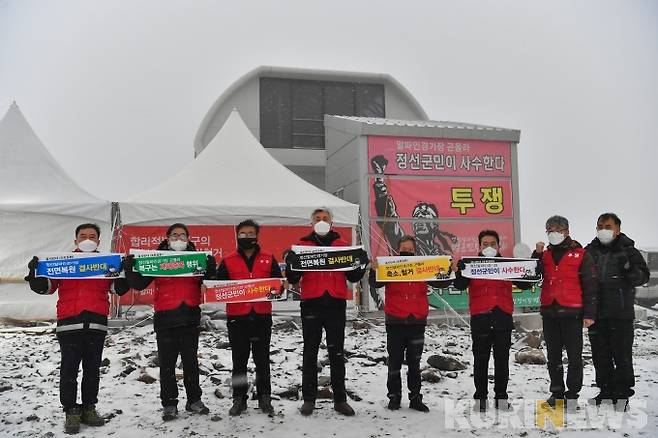 [정선=쿠키뉴스] 박하림 기자 =최승준 정선군수가 강원 정선군 가리왕산 하봉 정상에서 무기한 대정부 투쟁을 벌이고 있는 알파인경기장 철거반대 범 군민투쟁위원회를 찾아 위로했다고 13일 밝혔다.