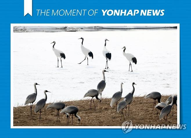 (철원=연합뉴스) 한상균 기자 = 13일 강원도 철원에서 재두루미와 두루미가 먹이를 찾고 있다. 재두루미는 철원에서 따뜻한 겨울을 보낸 뒤 번식지인 시베리아로 이동한다. 2021.1.13 [THE MOMENT OF YONHAPNEWS]