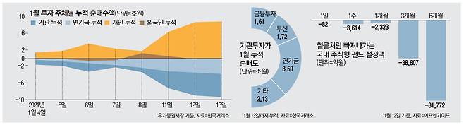 연기금은 지난달 24일부터 12거래일 연속으로 유가증권시장에서 매도를 이어갔고, 총 4조653억원어치를 팔아 치웠다. 금융투자 업계 관계자는 "연기금 등은 국내 주식 투자 비율이 정해져 있다"며 "지수가 가파르게 오르면서 투자 비율을 넘어서자 계속해서 매도하고 있는 것"이라고 설명했다.