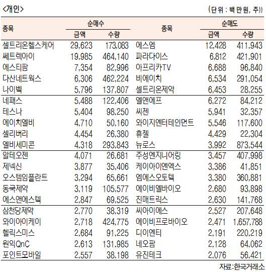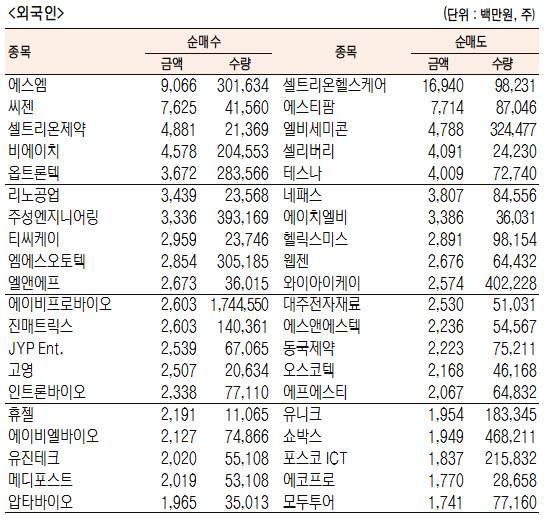 - [표]주간 코스닥 기관·외국인·개인 순매수·도 상위종목(1월 4일~8일)