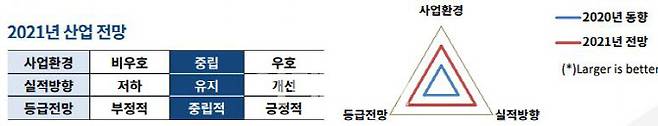저금리 기조 속 개인주식투자자의 꾸준한 신규 진입, 코로나19 백신 개발과 경기회복 기대 등이 증권업 사업환경 개선을 기대하게 하는 요인으로 꼽았다. 다만 여전히 국내외 자본시장의 불확실성이 높은 수준인 가운데 신용공여금 이자율 인하, 시장금리 상승 가능성 등은 영업실적에 부담 요인으로 작용할 수 있다고 판단했다.