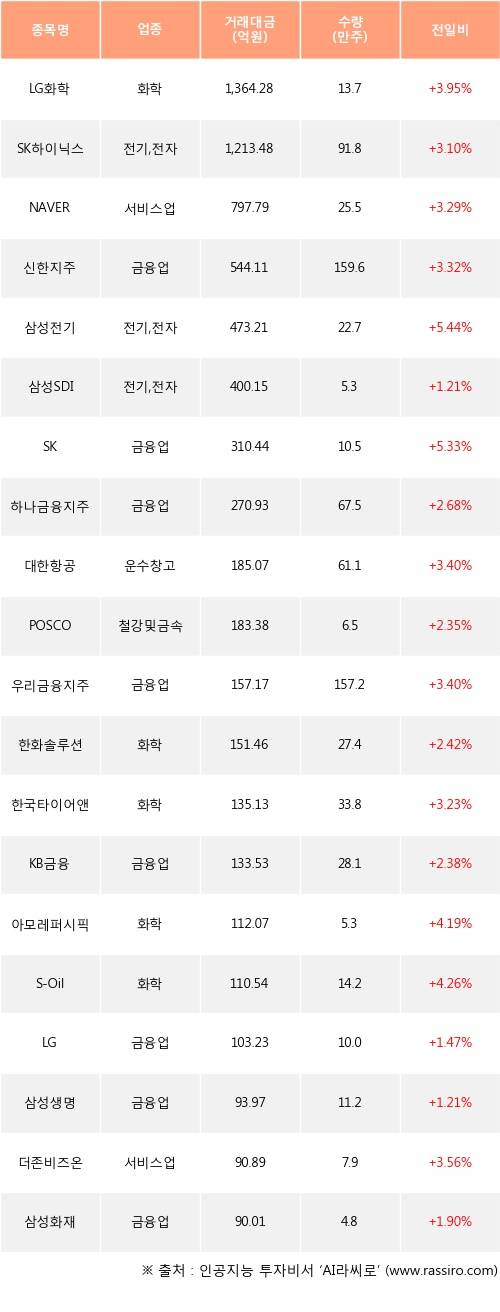 외국인 투자자의 순매수 상위 20개 종목은 LG화학, SK하이닉스, NAVER, 신한지주, 삼성전기, 삼성SDI, SK, 하나금융지주, 대한항공, POSCO등이다.