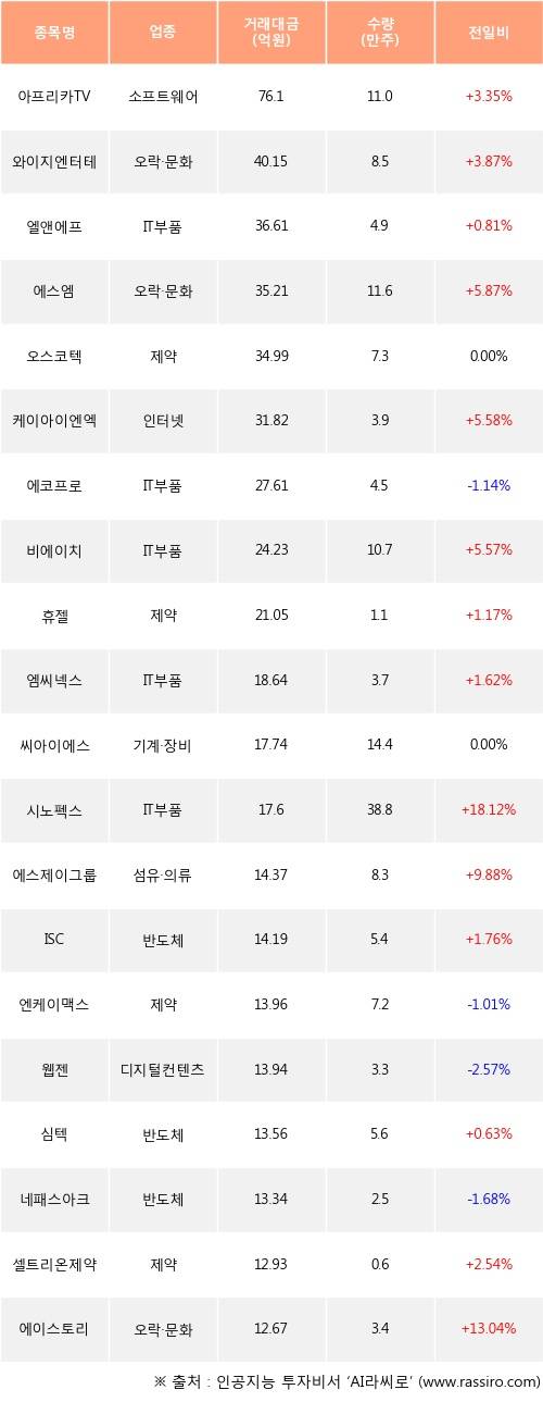 기관 투자자의 순매수 상위 20개 종목은 아프리카TV, 와이지엔터테인먼트, 엘앤에프, 에스엠, 오스코텍, 케이아이엔엑스, 에코프로, 비에이치, 휴젤, 엠씨넥스등이다.