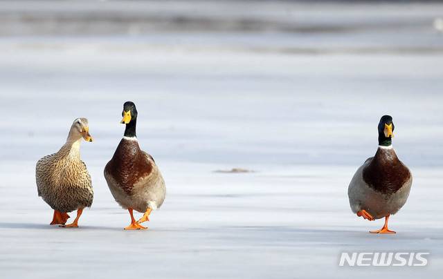 [광주=뉴시스] 변재훈 기자 = 한파가 지나가고 전국 대부분의 날씨가 풀린 13일 오후 광주 북구 전남대학교 내 용지 호수에서 오리들이 여유로운 시간을 보내고 있다. (사진=광주 북구 제공) 2021.01.13. photo@newsis.com