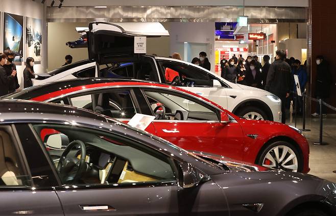 테슬라 코리아가 13일 서울 영등포구 롯데백화점 영등포점에서 '모델 Y'를 국내 최초 공개한 가운데 방문객들이 차량을 살펴보고 있다.