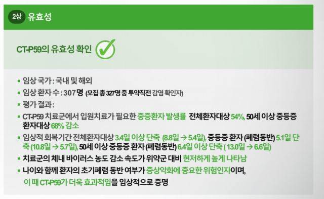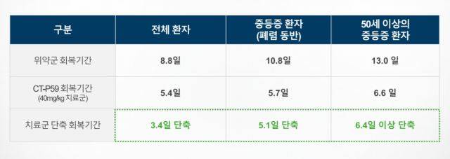 임상 2상은 경등~중등증 코로나19 환자 327명을 대상으로 진행됐다. 연구진은 환자가 투약 후 발열, 기침, 호흡곤란 등 코로나19 관련 증상에서 얼마나 빨리 회복됐는지 평가했다. 산소 공급이 필요한 중증 환자 치료 개선 여부도 부가적으로 확인했다.