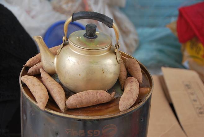 깡통을 뒤집어 얹힌 난로 위에서 미끈하게 잘생긴 고구마가 익어간다. 이웃 상인들과 나눠 마실 노란 주전자 속 커피물도 끓어 간다. 시장에선 어느 때보다 불조심이 강조되는 시기지만, 이마저도 못 쓰게 한다면 너무도 가혹한 처사가 아닐까 싶다.