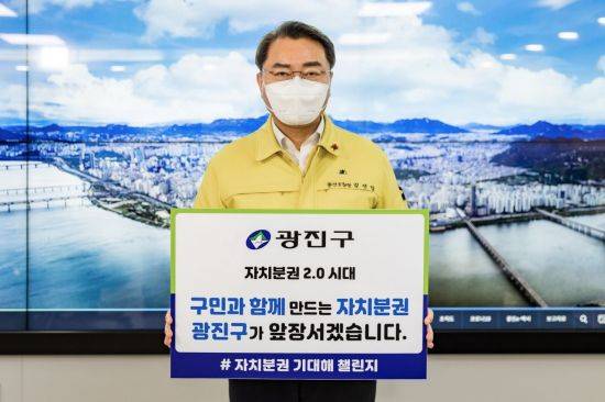 이정훈 강동구청장의 지명으로 챌린지에 참여한 김선갑 광진구청장은 '구민과 함께 만드는 자치분권, 광진구가 앞장서겠습니다'라는 응원 메시지를 전했다.