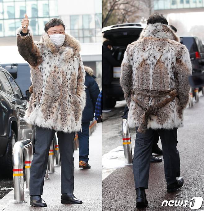 (서울=뉴스1) 권현진 기자 = 가수 남진이 13일 서울 영등포구 여의도 KBS에서 열리는 KBS 2TV '트롯 전국체전' 촬영 차 방송국으로 들어서고 있다. 이날 남진은 아무나 소화하기 힘든 호피무늬의 럭셔리 퍼를 입고 나타나 눈길을 끌었다. 2021.1.13/뉴스1