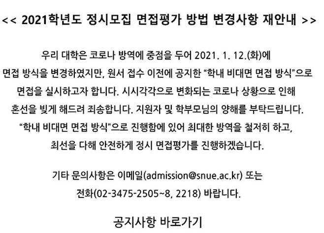13일, 서울교대는 공식 홈페이지 팝업창과 공지사항에 올린 긴급 공지문에서 "우리 대학은 코로나 방역에 중점을 두어 1월 12일에 면접 방식을 변경하였지만, 원서 접수 이전에 공지한 '학내 비대면 면접 방식'으로 면접을 실시하고자 한다"고 태도를 바꿨다.