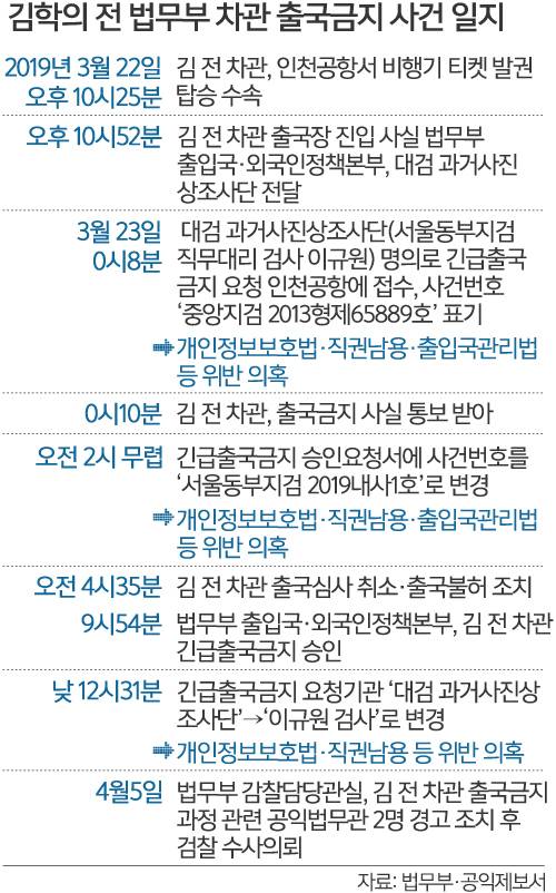 13일 세계일보 취재를 종합하면, 김 전 차관에 대해 긴급출국금지를 하기까지 법무부 외국인·출입국정책본부 담당자들은 절차적 위법성을 인지하고 있었던 것으로 파악됐다. 이는 국민권익위원회에 제출된 공익신고서에 담긴 담당자들 간 대화 내용에도 나온다. 이들은 김 전 차관에 대한 출금요청서가 통상적인 요청서와 다른 점을 두고 “양식과 관인도 어떡하죠”라거나 “과장님도 보시고 걱정하심”이라는 대화를 나눴다.