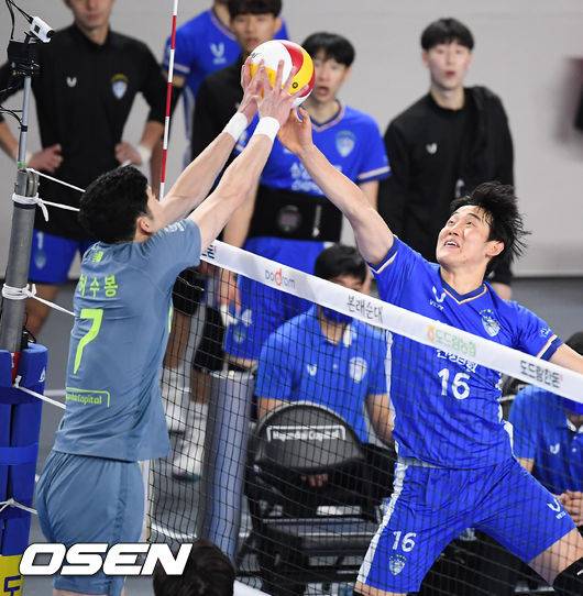 2세트 현대캐피탈 허수봉과 삼성화재 김동영이 공을 다투고 있다. / soul1014@osen.co.co.kr