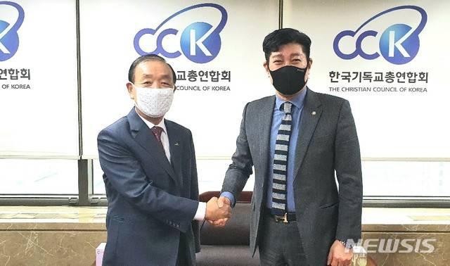 [서울=뉴시스]조수정 기자 = 한국기독교총연합회 대표회장 직무대행 김현성 변호사가 12일 오후 한기총 사무실에서 한국교회연합 대표회장 송태섭 목사와 간담회를 갖고 기념촬영 하고 있다. (사진=한국기독교총연합회 제공) 2021.01.13. photo@newsis.com