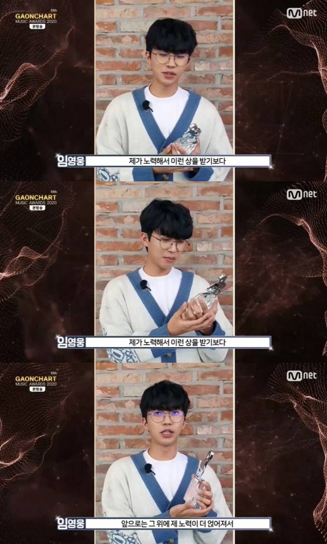영상을 통해 임영웅은 "아무나 받을 수 없는 상인데 제가 노력해서 상을 받기보다 여러분들께서 많은 사랑을 보내주셔서 받을 수 있는 상이라 특별하다"며 "앞으로는 그 위에 제 노력이 얹어져서 2021년에도 더 좋은 상 많이 받을 수 있도록 노력하겠다. 항상 건강하고 행복하시길 바라겠다. 감사하다"고 소감을 전했다.