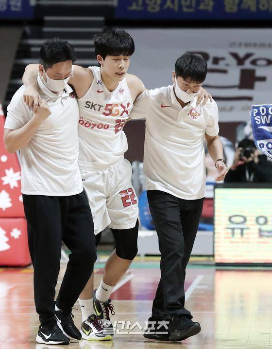 2020~2021 프로농구 고양오리온과 서울SK의 경기가 13일 오후 경기 고양체육관에서 열렸다. 4쿼터 SK 오재현이 부상으로 쓰러져 부축을 받으며 교체되고 있다.