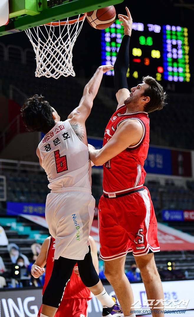 2020-2021 KBL리그 고양 오리온과 서울 SK의 경기가 13일 고양체육관에서 열렸다. 오리온 위디가 SK 장문호를 제치며 골밑슛을 시도하고 있다. 고양=정재근 기자 cjg@sportschosun.com/2021.1.13/