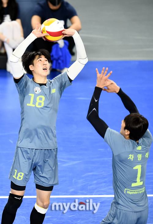 [마이데일리 = 천안 곽경훈 기자] 현대캐피탈 김명관이 13일 오후 충청남도 천안시 천안유관순체육관에서 진행된 '2020-2021 도드람 V-리그' 현대캐피탈-삼성화재의 경기에서 토스를 하고 있다.- ⓒ마이데일리(www.mydaily.co.kr). 무단전재&재배포 금지 -