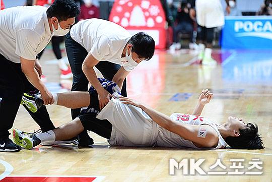 서울 SK 오재현이 다리부상을 입고 통증을 호소하고 있다.