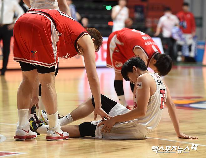 [엑스포츠뉴스 고양, 김한준 기자] 13일 오후 경기도 고양실내체육관에서 열린 '2020~2021 현대모비스 프로농구' 고양 오리온과 서울 SK의 경기, SK 오재현이 경련으로 고통스러워하고 있다.
