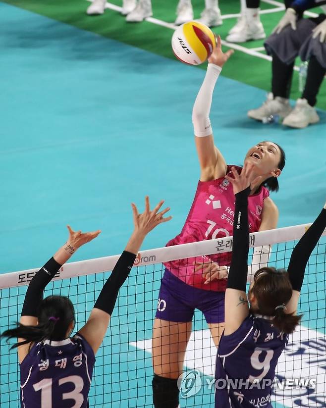 (김천=연합뉴스) 김현태 기자 = 13일 오후 김천실내체육관에서 열린 도드람 2020-2021 V리그 배구 여자부 흥국생명과 한국도로공사의 경기. 흥국생명 김연경이 공격하고 있다. 2021.1.13