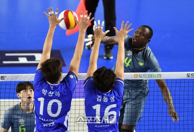 13일 천안 유관순체육관에서 열린 2020-2021 V리그 남자부 현대캐피탈과 삼성화재의 경기에서 현대캐피탈 다우디(오른쪽)의 공격이 삼성화재 박상하의 블로킹에 막히고 있다. 2021. 1. 13.