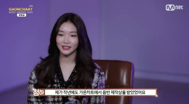 코로나19 완치 후 건강한 모습으로 영상에 등장한 청하는 "작년에도 가온차트에서 음반 제작상을 받았다. 좋은 추억도 많이 만들었는데 올해도 좋은 추억 만들어주셔서 감사하다. 'BAD BOY'는 혼자 부른게 아니라 크리스토퍼 님이랑 같이 불렀다. 그 기회를 만들어준 소속사 식구들, 관계자분들에게 감사드린다. 리서너 분들게 이 상을 돌리고 싶다"고 소감을 밝혔다.