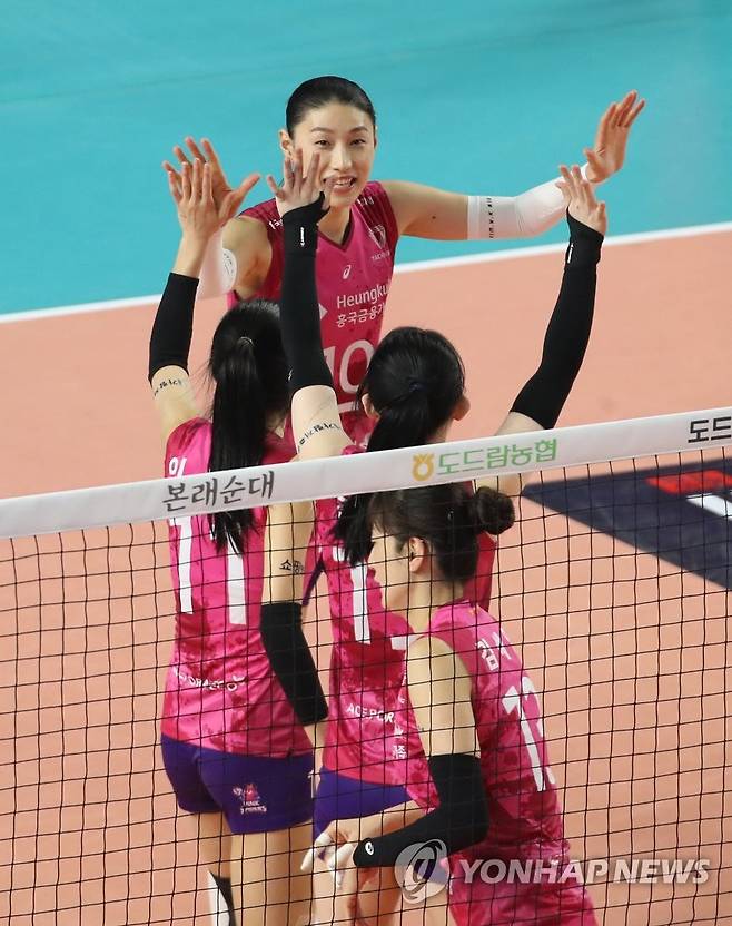 (김천=연합뉴스) 김현태 기자 = 13일 오후 김천실내체육관에서 열린 도드람 2020-2021 V리그 배구 여자부 흥국생명과 한국도로공사의 경기. 흥국생명 선수들이 득점에 성공 후 기뻐하고 있다. 2021.1.13