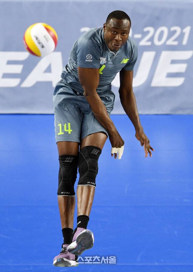 현대캐피탈 다우디가 13일 천안 유관순체육관에서 열린 2020-2021 V리그 남자부 현대캐피탈과 삼성화재의 경기에서 스파이크 서브를 넣고 있다. 2021. 1. 13.