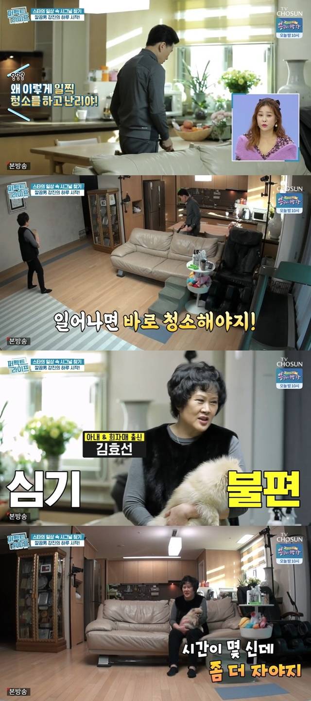 강진은 “제가 성격이 급하고 해서. 시키면 당하는 입장에서는 기분 나쁠 수도 있어서 제가 하는 편이다”고 설명했고, 아내 김효선은 강진이 물걸레질까지 하자 “무슨 물걸레질을 그렇게 자주 하는지. 하나도 안 묻었는데”라고 불평했다. (사진=TV조선 ‘퍼펙트라이프’ 캡처)