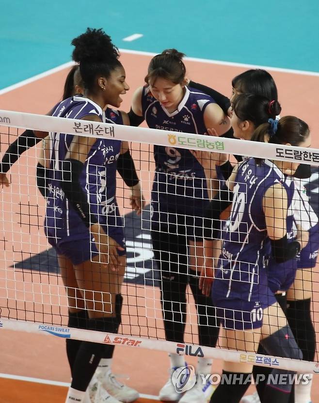 (김천=연합뉴스) 김현태 기자 = 13일 오후 김천실내체육관에서 열린 도드람 2020-2021 V리그 배구 여자부 흥국생명과 한국도로공사의 경기. 도로공사 선수들이 득점에 성공 후 기뻐하고 있다. 2021.1.13