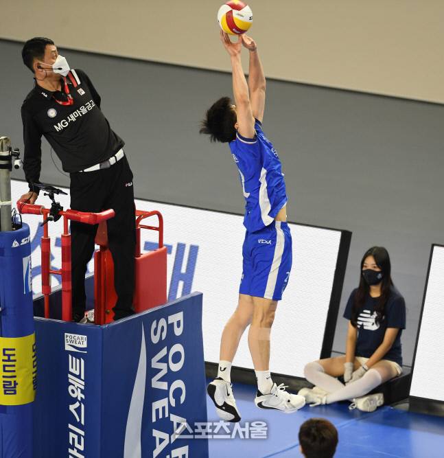 삼성화재 세터 이승원이 13일 천안 유관순체육관에서 열린 2020-2021 V리그 남자부 현대캐피탈과 삼성화재의 경기에서 주심 뒤로 넘어간 공을 힘겹게 토스를 올리고 있다. 2021. 1. 13.