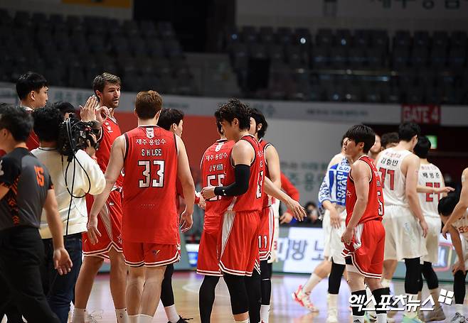 이날 경기에서 승리한 오리온 선수들이 기뻐하고 있다.