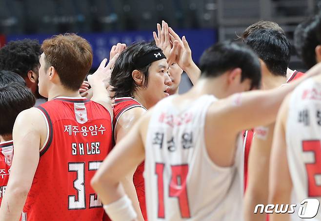 (고양=뉴스1) 이성철 기자 = 13일 오후 경기 고양시 고양체육관에서 열린 프로농구 2020-2021 현대모비스 KBL 고양 오리온 오리온스와 서울 SK나이츠의 경기에서 85대 73으로 승리한 오리온 선수들이 기뻐하고 있다. 2021.1.13/뉴스1