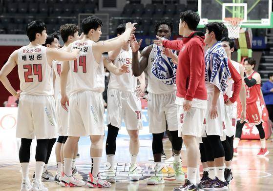 2020~2021 프로농구 고양오리온과 서울SK의 경기가 13일 오후 경기 고양체육관에서 열렸다. 경기에서 패한 서울SK 선수들이 아쉬워하고 있다.