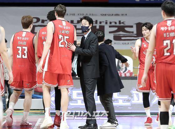 2020~2021 프로농구 고양오리온과 서울SK의 경기가 13일 오후 경기 고양체육관에서 열렸다. 경기에서 승리한 선수들을 강을준 감독이 맞이하고 있다.
