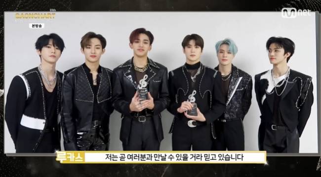 이어 “세계로 나아가기 위해서 저희는 연습과 무대 하나하나 음악 하나하나에 많은 열정을 쏟으면서 해나가고 있다. 앞으로도 기대해 달라”고 덧붙였다. (사진= '제10회 가온차트 뮤직 어워즈' Mnet 생중계 캡처)