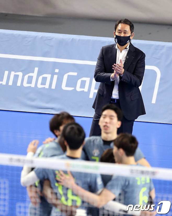 (서울=뉴스1) 김명섭 기자 = 13일 천안 유관순 체육관에서 열린 도드람 V리그 현대캐피탈과 삼성화재의 경기에서 최태웅 현대캐피탈 감독이 선수들을 격려하고 있다. (현대캐피탈 배구단 제공) 2021.1.13/뉴스1