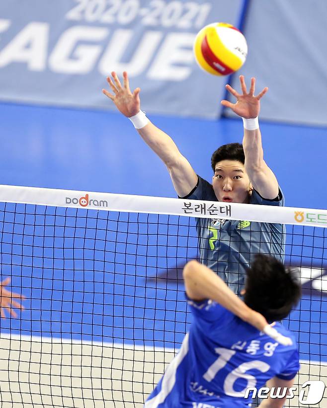 (서울=뉴스1) 김명섭 기자 = 13일 천안 유관순 체육관에서 열린 도드람 V리그 현대캐피탈과 삼성화재의 경기에서 현대캐피탈 허수봉이 블로킹을 하고 있다. (현대캐피탈 배구단 제공) 2021.1.13/뉴스1