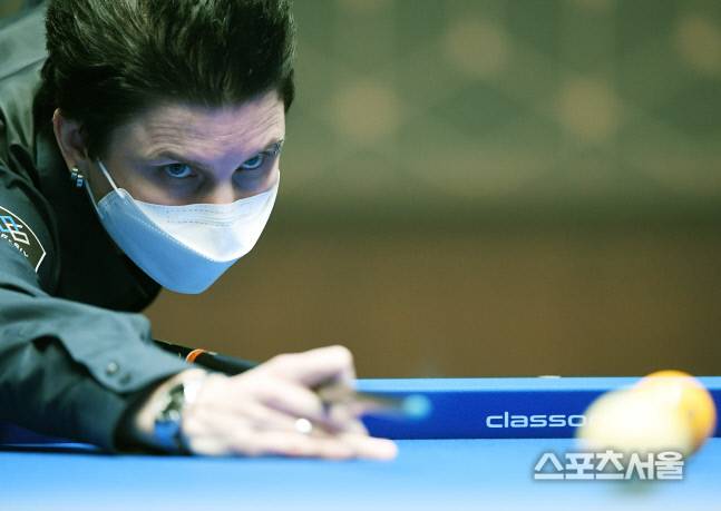 테레사 크롬펜하우어(네덜란드)가 13일 경기도 일산 MBC드림센터에서 진행된 ‘‘코리아 당구 그랑프리’ 여자 3쿠션 경기에서 이신영을 맞아 승부를 펼치고있다. 2021.01.13. 김도훈기자 dica@sportsseoul.com