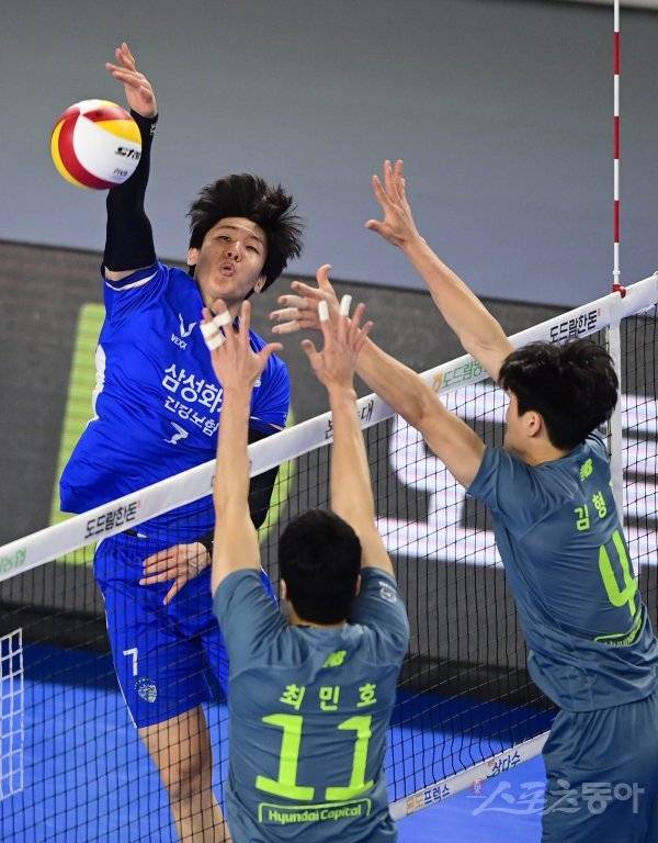 삼성화재 신장호가 스파이크를 때리고 있다.