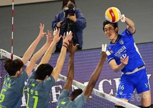삼성화재 김동영이 스파이크를 때리고 있다.