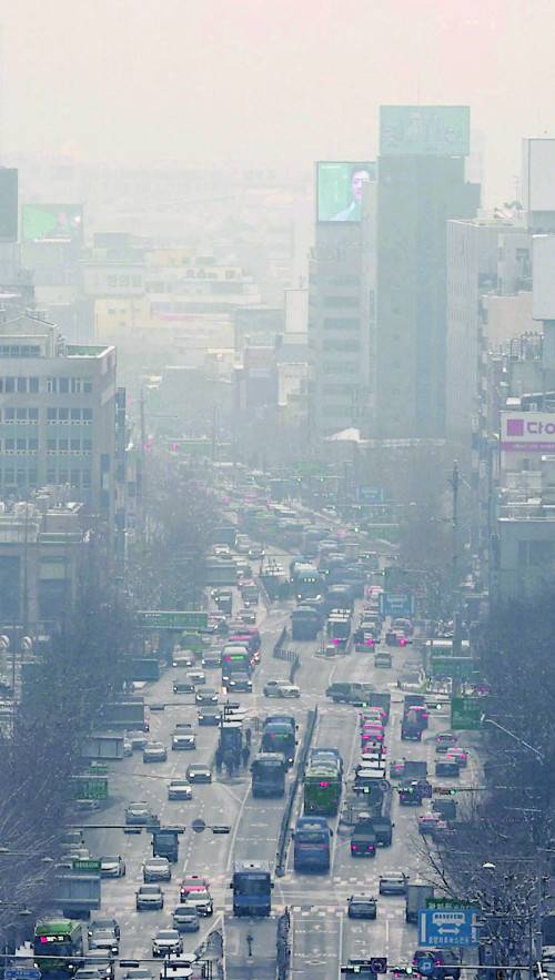 한파가 한풀 꺾인 13일 미세먼지 농도가 '나쁨'으로 올라가면서 서울 종로 일대가 뿌옇게 보이고 있다. 14일에도 기온은 평년보다 높겠지만 수도권 등 전국 대부분 지역의 미세먼지 농도는 '나쁨' 수준일 것으로 예상된다.