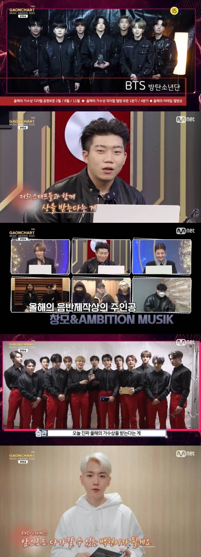 방탄소년단은 올해의 가수상 디지털 음원부문 2월, 8월, 11월, 올해의 가수상 피지컬 음반 부문 1분기와 4분기, 올해의 리테일 앨범상을 수상해 6관왕에 올랐다. 수상 후 방탄소년단은 영상을 통해 “큰 상을 주셔서 감사하다. 멋진 음악과 퍼포먼스를 선사하기 위해 정말 노력했는데 상까지 받게 돼서 매우 기쁘다. 의미 있는 상 주신 관계자 분들, 무엇보다 올 한해 저희 노래를 들어주시고 사랑해주신 아미(공식 팬덤) 여러분들에게 감사를 전한다”고 말했다.