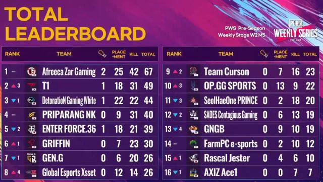 아프리카 자르는 13일 온라인으로 진행된 ‘PUBG 위클리 시리즈(PWS)’ 동아시아 프리시즌 위클리 스테이지 2주차 1경기(매치1~매치5)에서 67점(킬 포인트 42점)을 누적하며 1위를 차지했다. 그 뒤로 T1, 데토네이션 화이트(일본), 프리파랑, 엔터 포스(일본), 그리핀, 젠지, GEX(대만·홍콩·마카오) 등이 8위권에 포진했다.