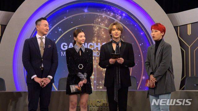 [서울=뉴시스]조수정 기자 = 주영훈, 그룹 ITZY 리아, 슈퍼주니어 이특, 재재(왼쪽부터)가 13일 열린 제10회 가온차트 뮤직어워즈를 진행하고 있다. (사진=가온차트뮤직어워즈 제공) 2021.01.13. photo@newsis.com