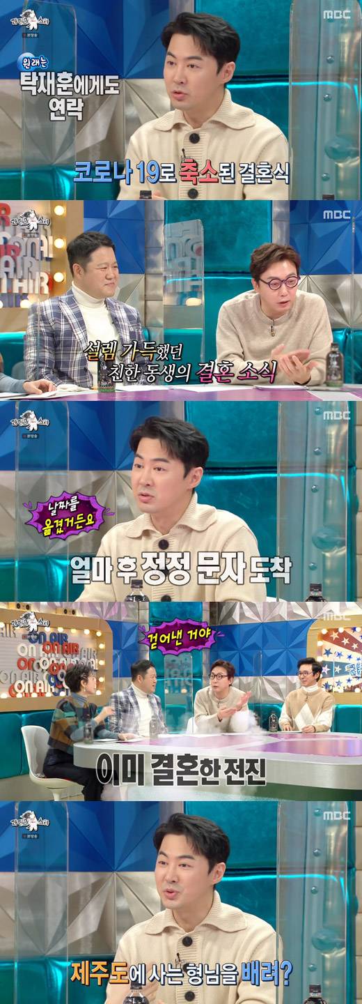 탁재훈은 "전진한테 굉장히 들떠서 문자가 왔다. 그러다 날짜 옮겼다고 정정 문자가 왔었는데 어느 순간 결혼해서 TV에 나왔다"고 억울함을 드러냈다.