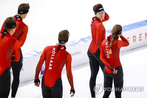 epa08934921 Dutch skater Jorien ter Mors (2-R) reacts next to teammate Melissa Wijfje (R) during a training session for the ISU European Speed Skating Championships at the Thialf in Heerenveen, Netherlands, 13 January 2021. The ISU European Speed Skating Championships will take place on 16-17 January 2021. EPA/Vincent Jannink