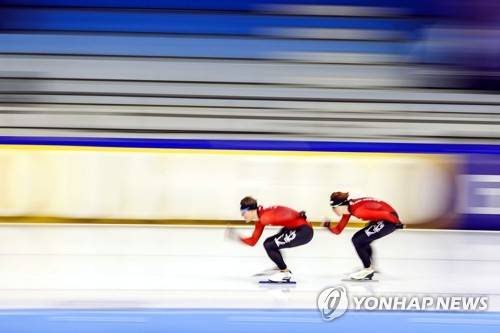 epa08934927 Dutch skater Jorien ter Mors (R) performs during a training session for the ISU European Speed Skating Championships at the Thialf in Heerenveen, Netherlands, 13 January 2021. The ISU European Speed Skating Championships will take place on 16-17 January 2021. EPA/Vincent Jannink