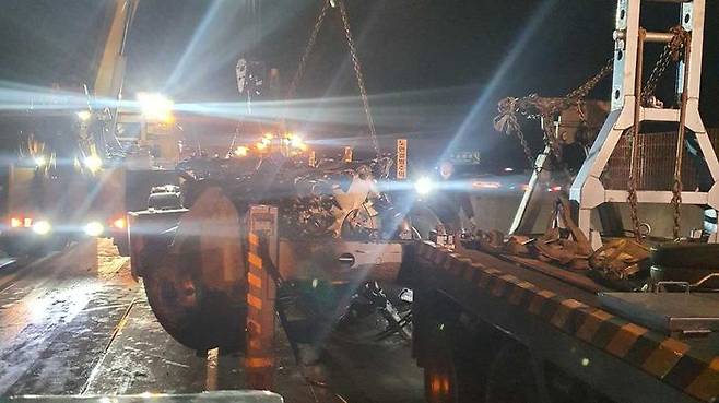 이 사고로 뒤따르던 승용차가 트럭을 추돌하고 맞은편 도로를 달리던 승용차 3대가 중앙분리대 파편에 부딪혀 파손됐습니다.